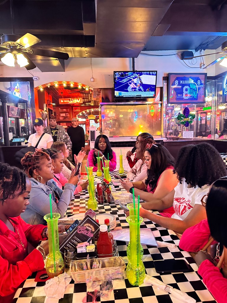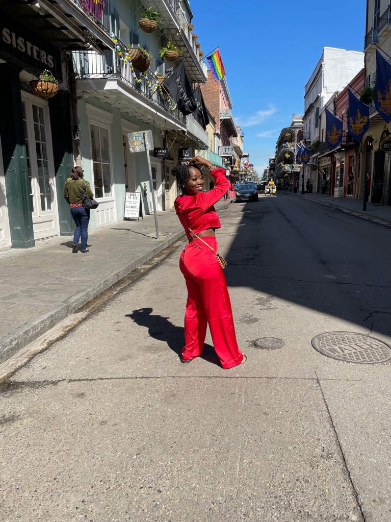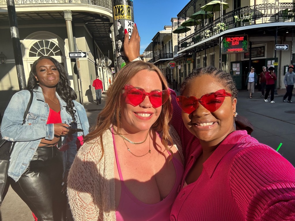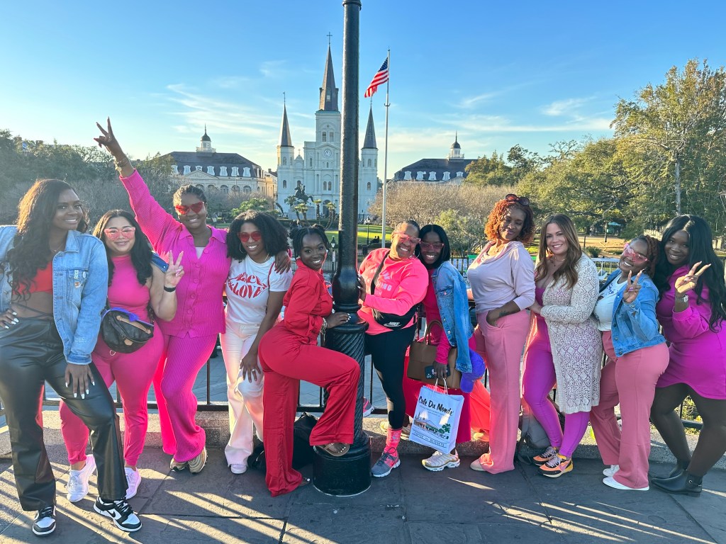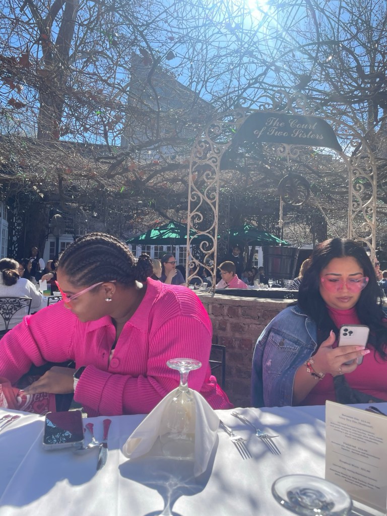 The day of our adventure arrived, and excitement filled the air as we boarded the plane. Dressed in accents of red or pink, we were ready to take on whatever New Orleans had in store for us.